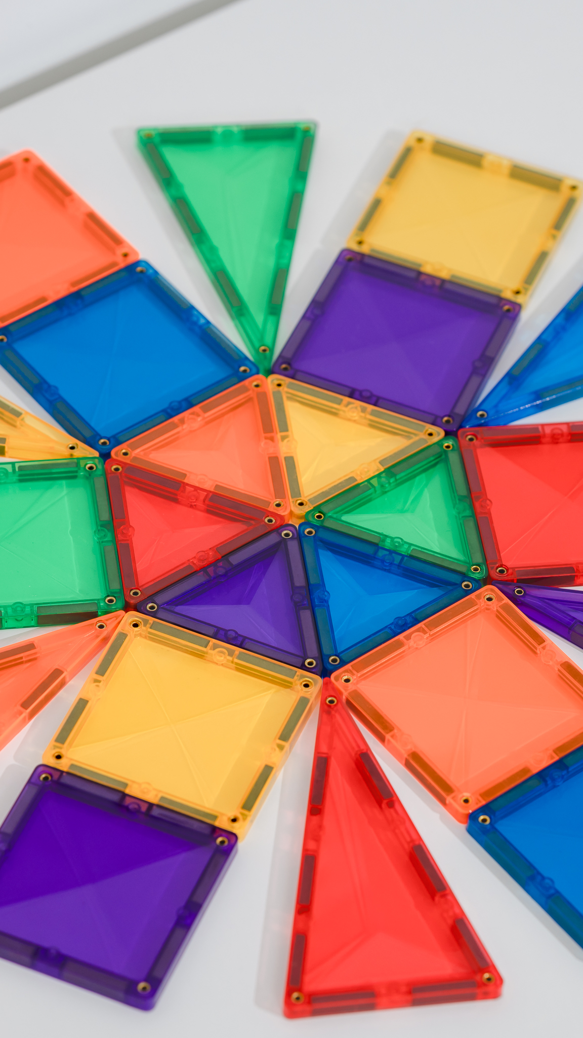 • الشكل: ألواح مغناطيسية هندسية شفافة بألوان جذابة.