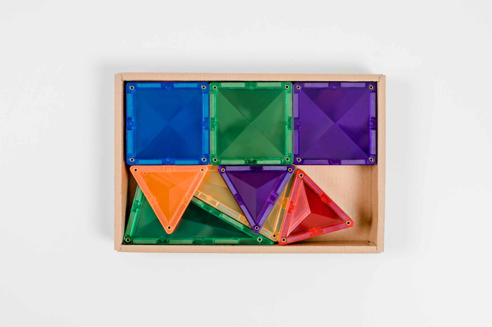 • محتويات العلبة: 12 مربع صغير، 6 مثلثات متساوية الساقين، 6 مثلثات متساوية الأضلاع.