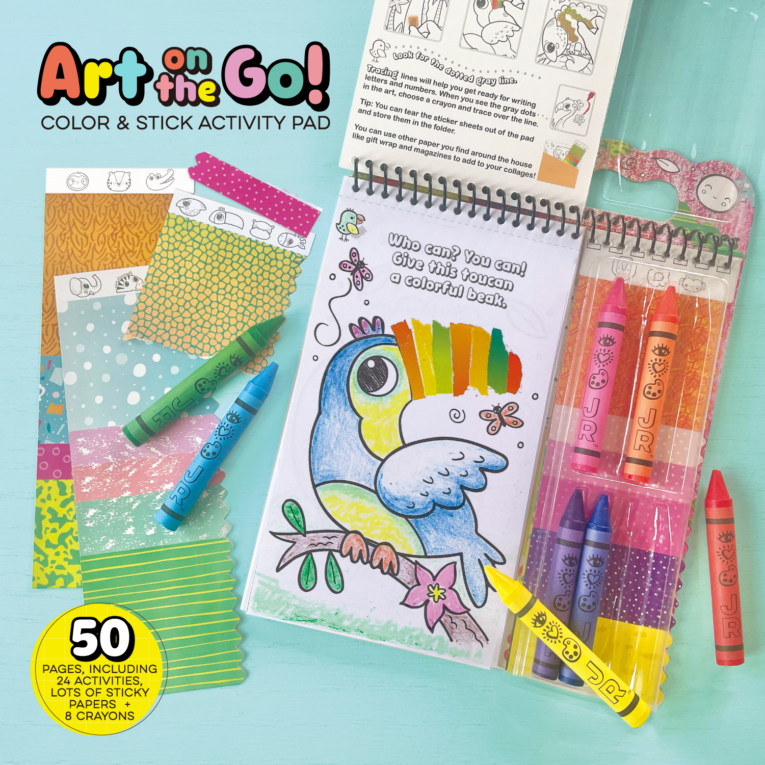 Kids’ activity and coloring book, which develops your child’s creative and motor skills, comes with 8 thick wax crayons.