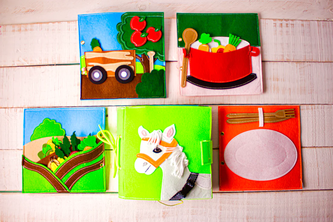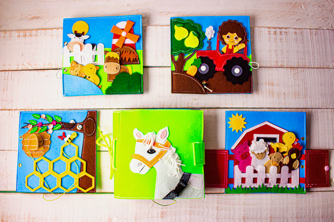 Fun on the Farm busy book is suitable for 1-7 years depending on your child’s abilities and interests.