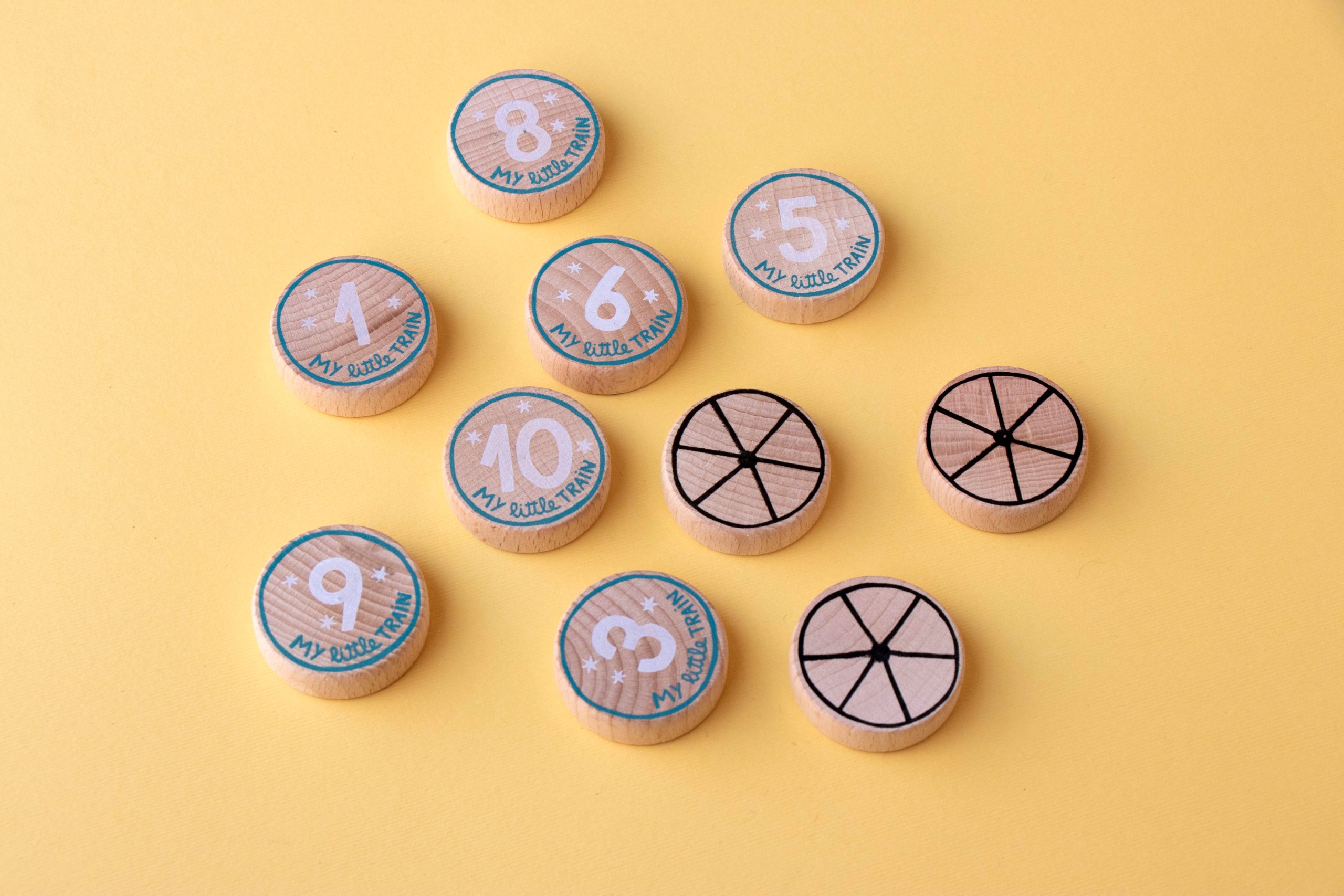Ten 3-piece puzzles in the shape of train carriages with a wooden piece that fits into each one.