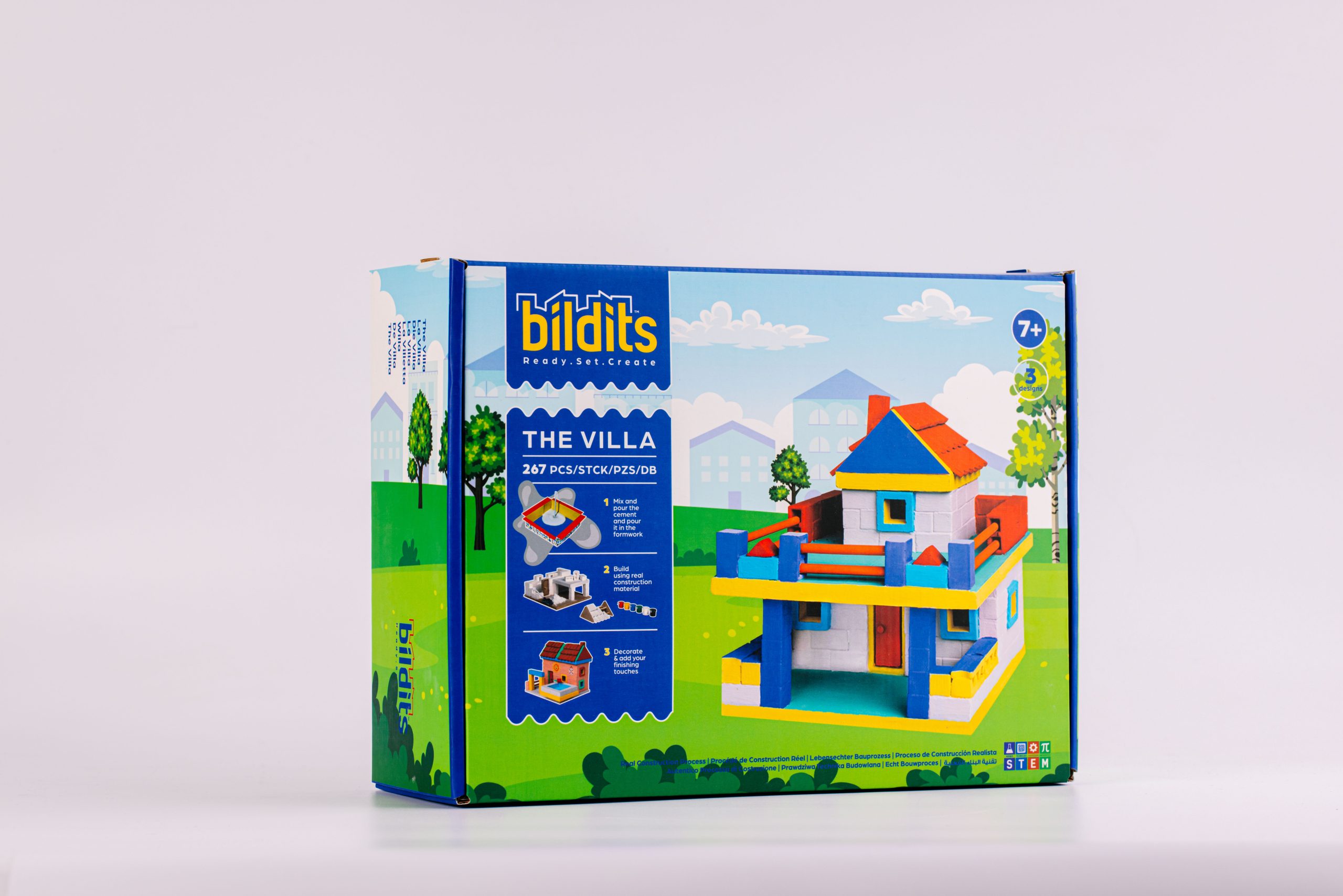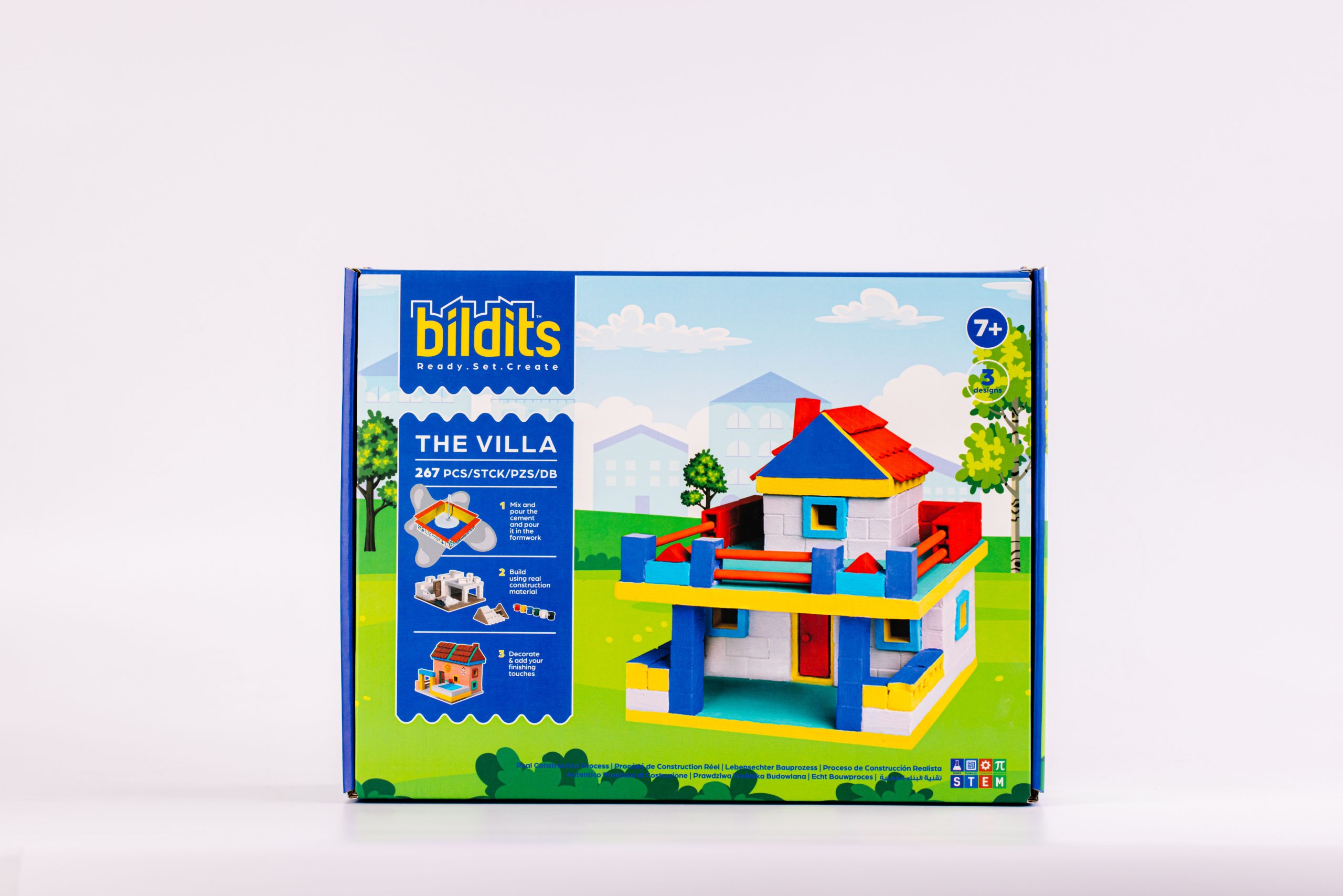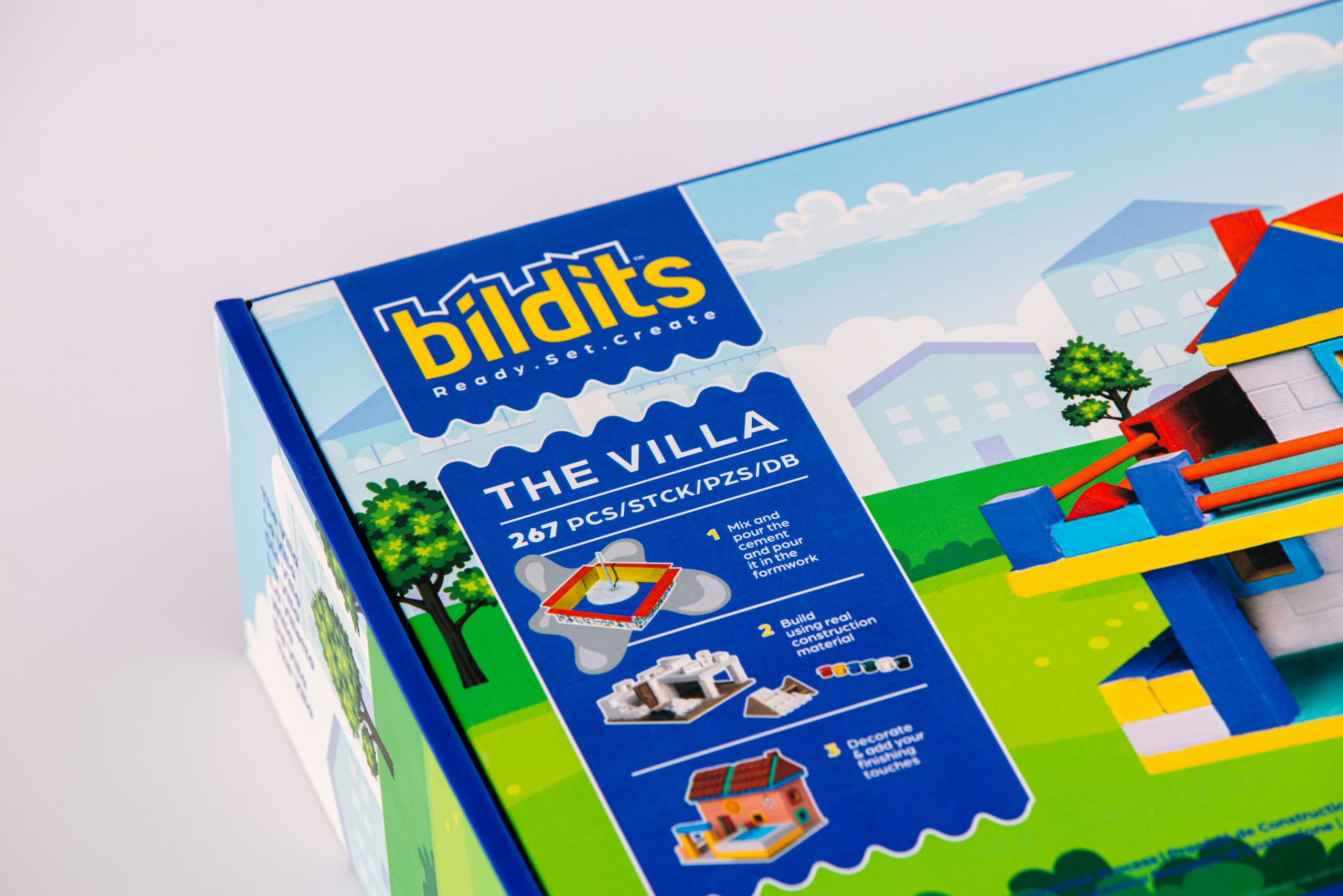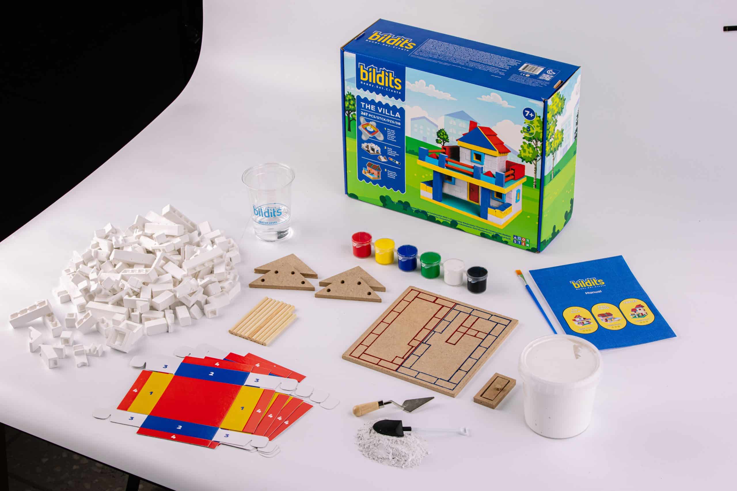 A realistic construction toy that shapes the creators of tomorrow. Build the house of your dreams today like a real engineer with Bildits. The Villa: A terrace to stargaze from. A balcony over your car. A pool to enjoy with friends. With The Villa kit, you can pick any of these designs or create your own single or double-story house using real materials, like bricks, a roof and our patented cement mix with origami molds. The engaging steps help develop skills like focus and commitment, while teaching you the real construction process.