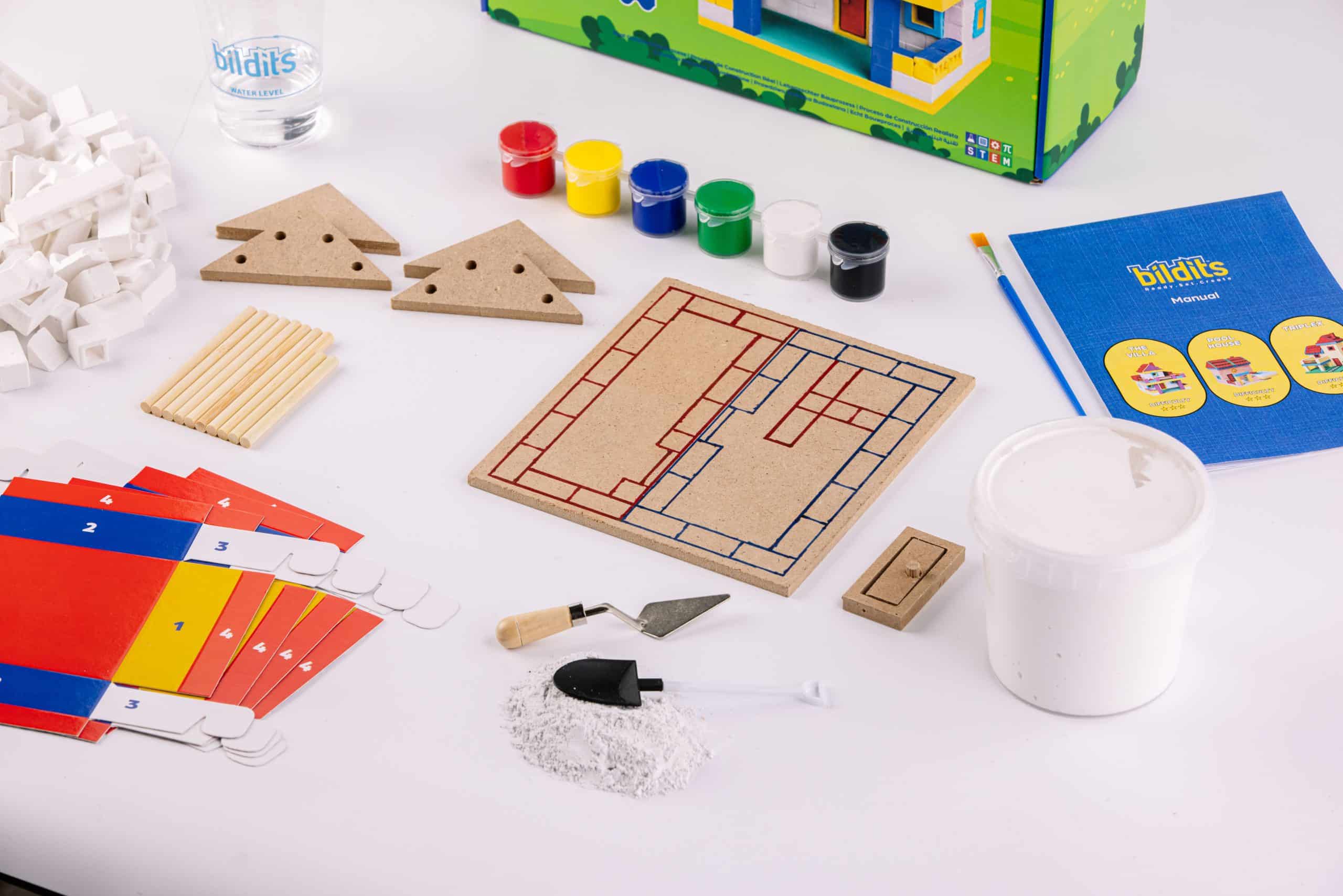 Bildits Juniors Series; an easy introduction to real-world engineering with actual construction tools and thinking. These kits are ideal for first-timers and younger creators, with diverse tasks across the construction process that’ll keep them captivated from start to finish. Learn about bricklaying, roof installation and concrete pouring, while folding origami molds and using our patented cement mix to build a home just the way you like it. Use one of our proposed design templates or build from your imagination.