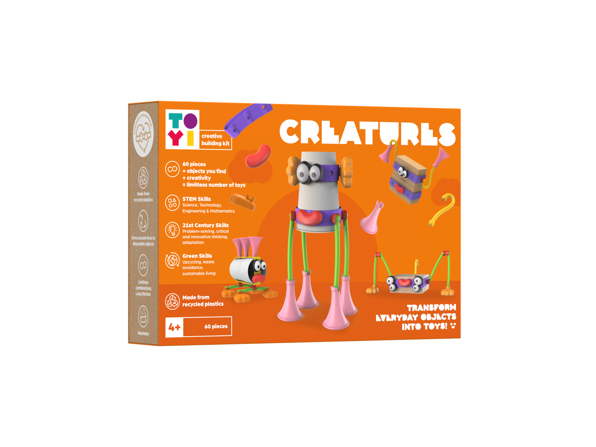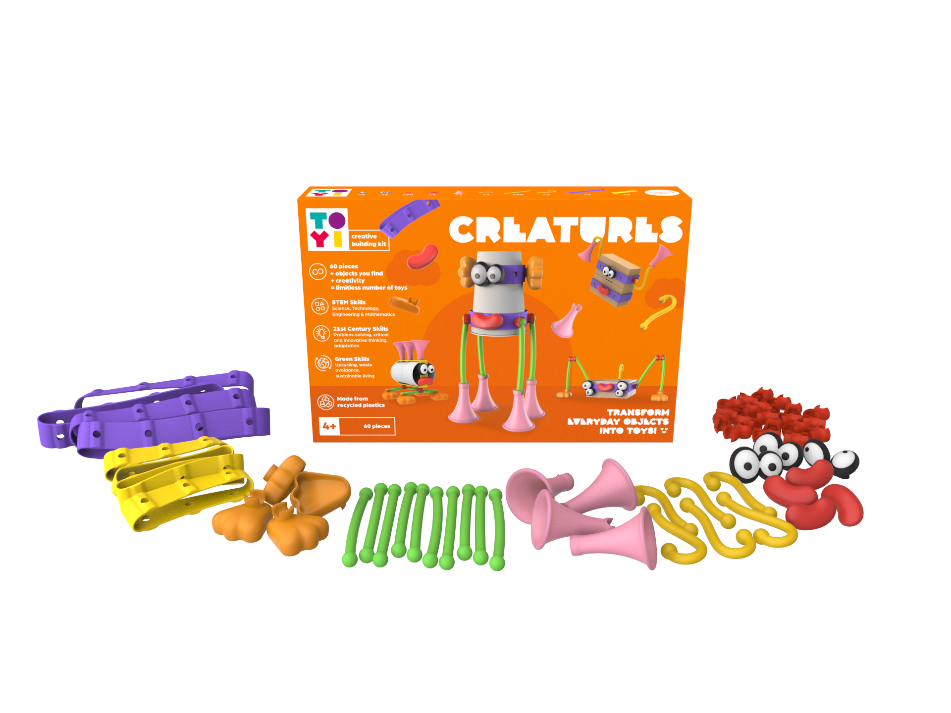 Toyi offers children a new play system by allowing them to include the objects they find around them in the play process. With the Toyi Creatures Creative Building Kit, all children aged 4 and over will gain creative perspective as they learn upcycling through play. They will have fun while developing their STEM (Science, Technology, Engineering, and Mathematics) skills by creating unique solutions to the design challenges in the playbook.